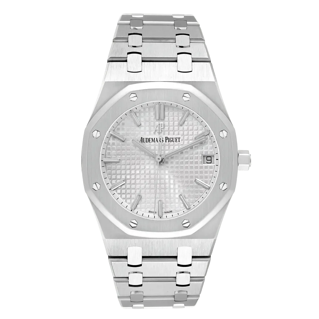 The grey dial is beautifully adorned with the “Grande Tapisserie” pattern, a signature of the Royal Oak series. It showcases luminous hour markers and hands that provide optimal legibility. The date window at 3 o’clock adds daily practicality without disturbing the clean symmetry of the dial.