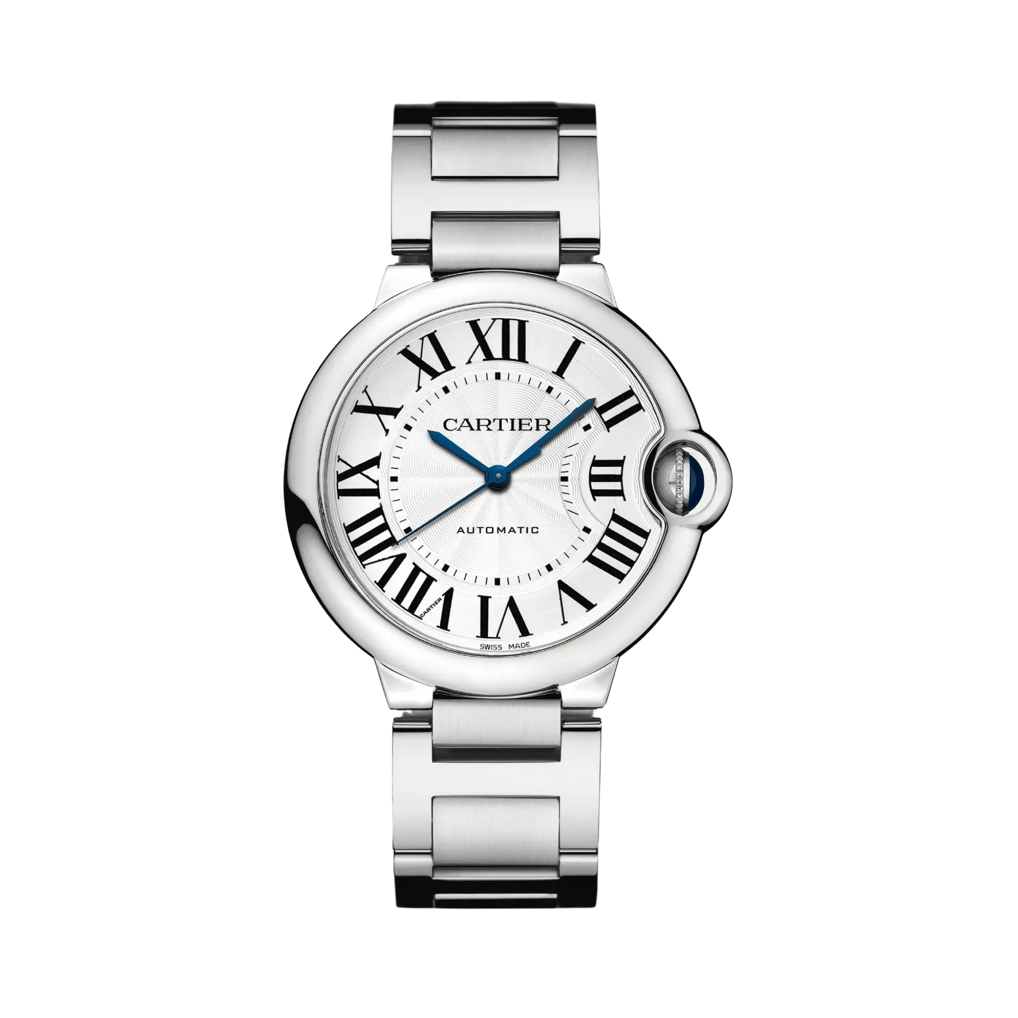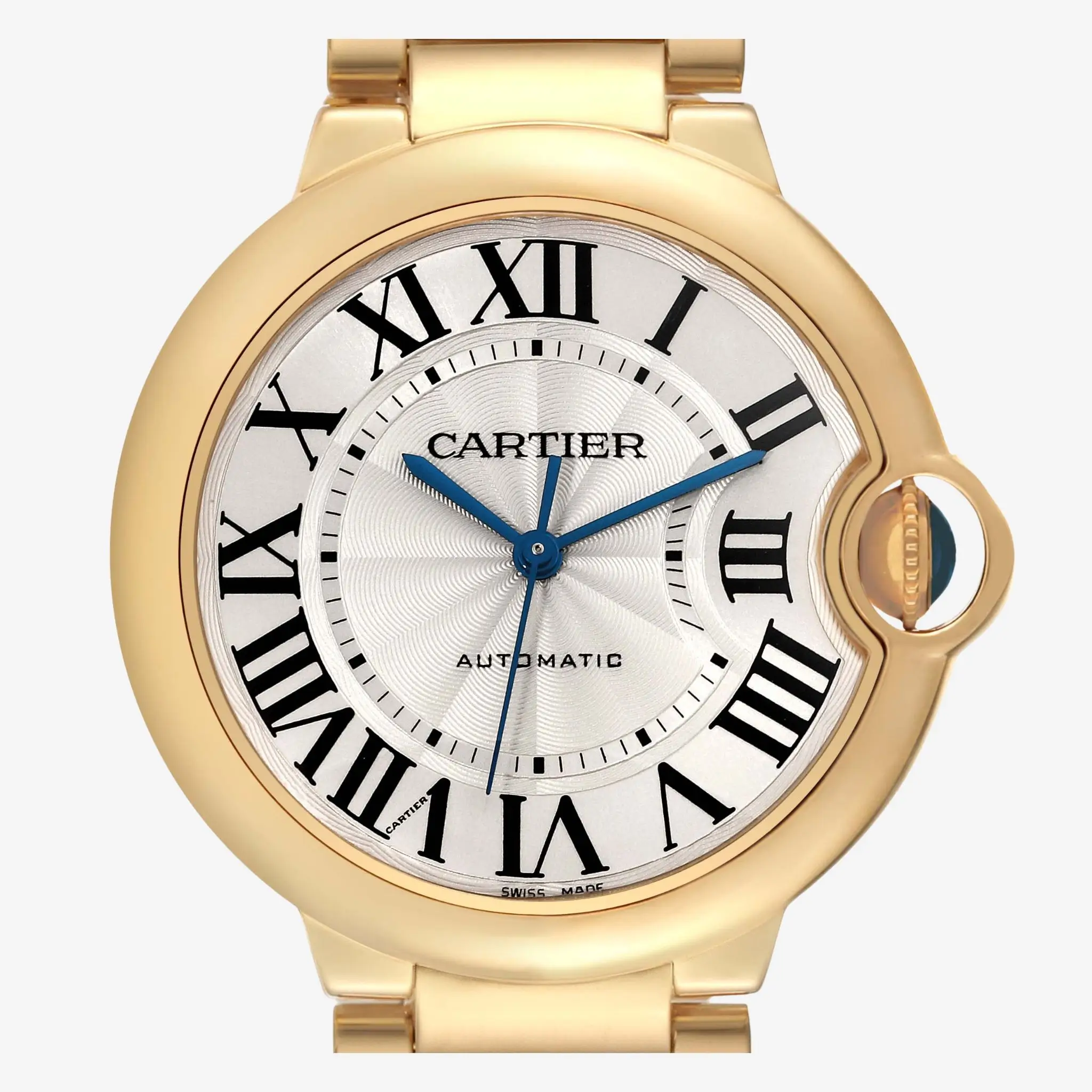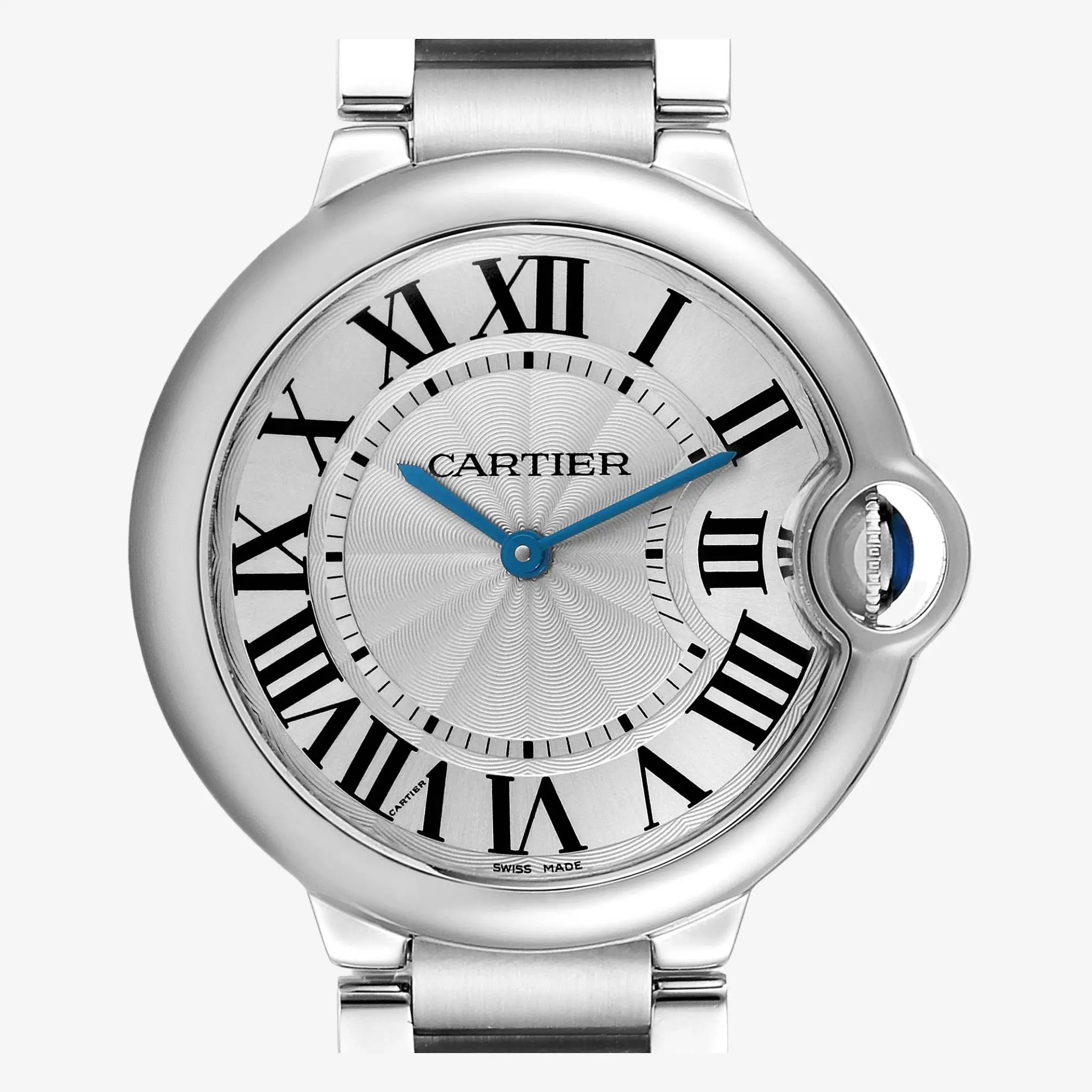 | Dial | Silver guilloche dial with Roman numerals. Blued steel sword shape hands. Secret Cartier signature at VII. |