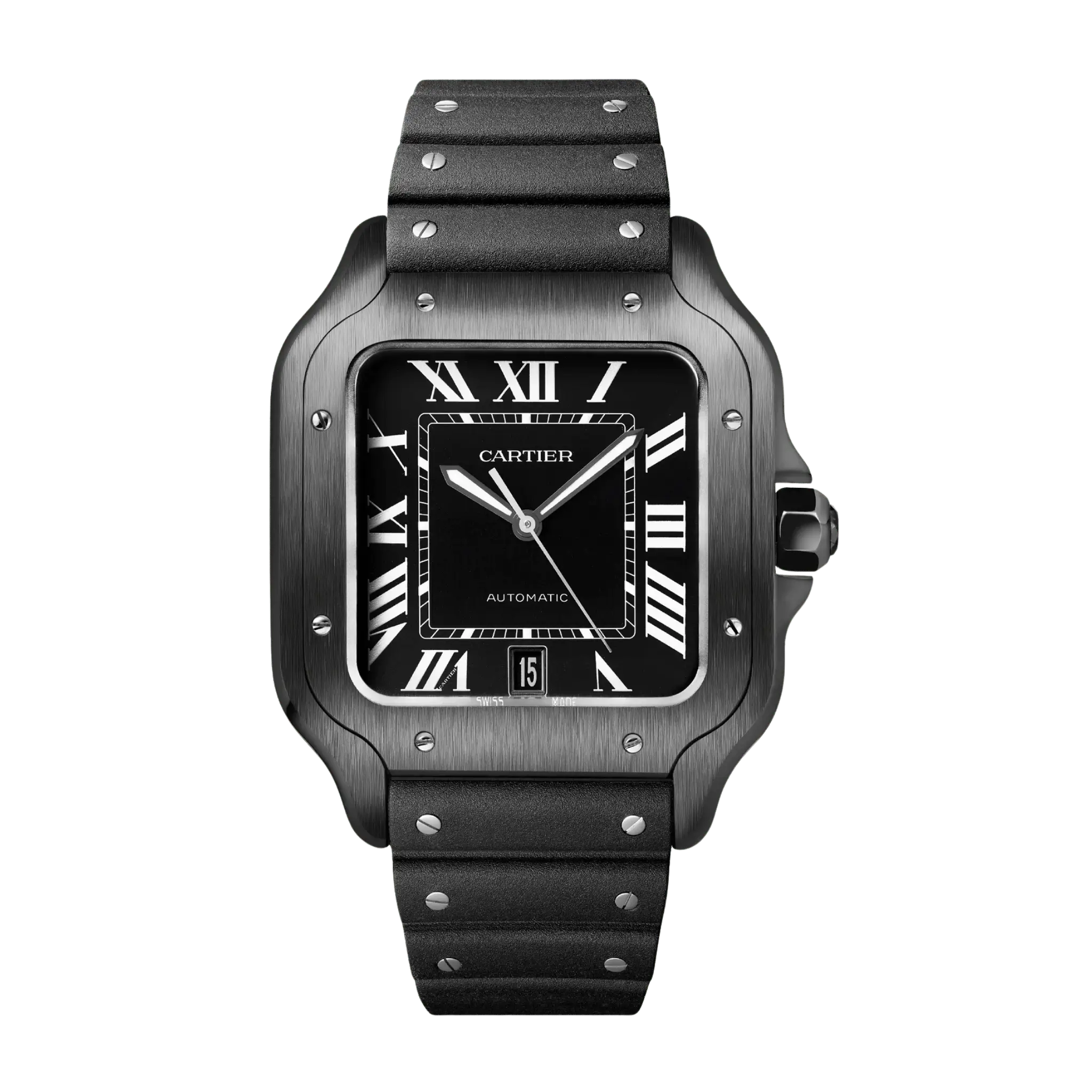 | Dial | Black dial with luminescent radial Roman numeral hour markers and an inner minute track. Luminescent sword-shaped oxidized hands. Secret Cartier signature at VII |