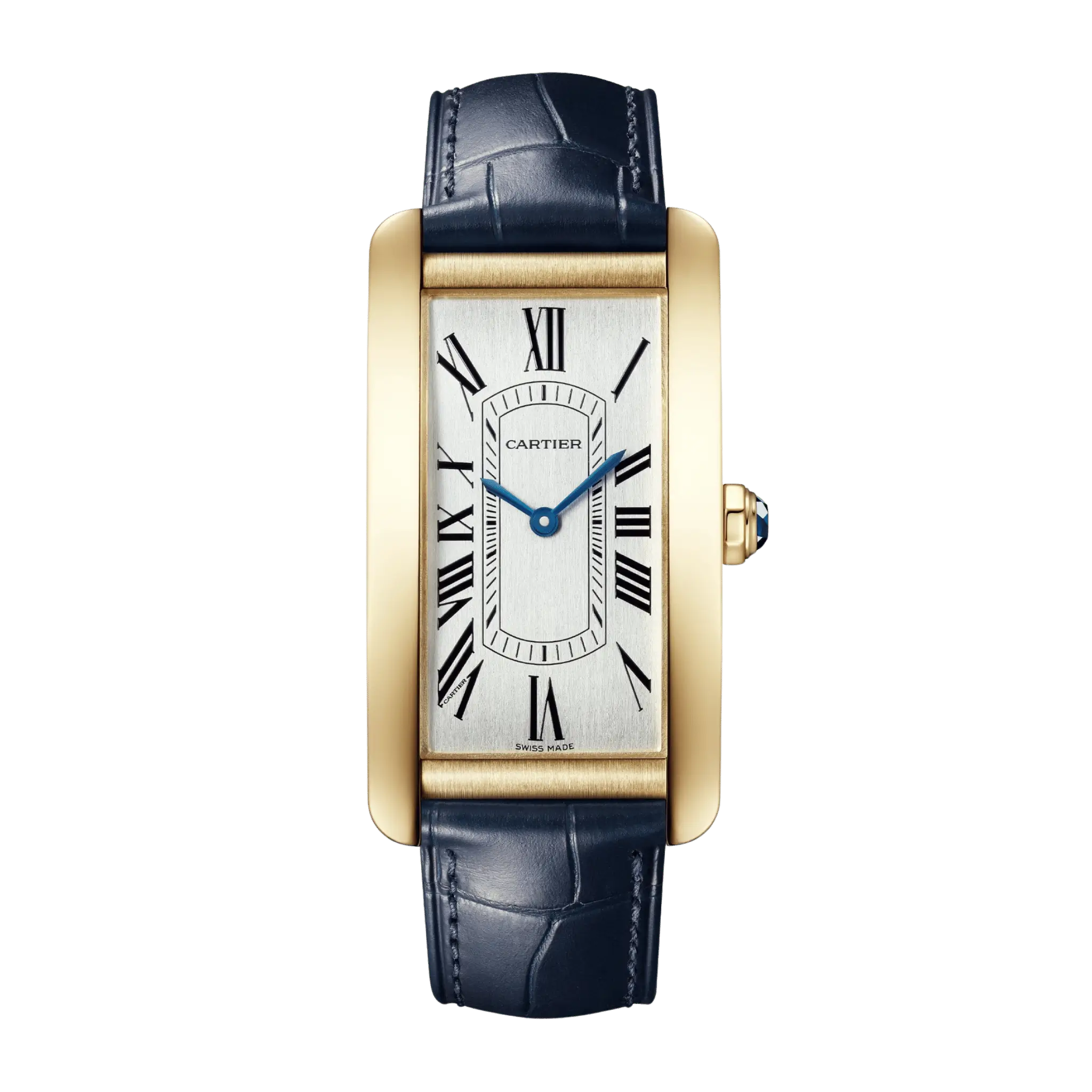| Bracelet | Black leather strap with 18K yellow gold tang buckle. |