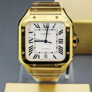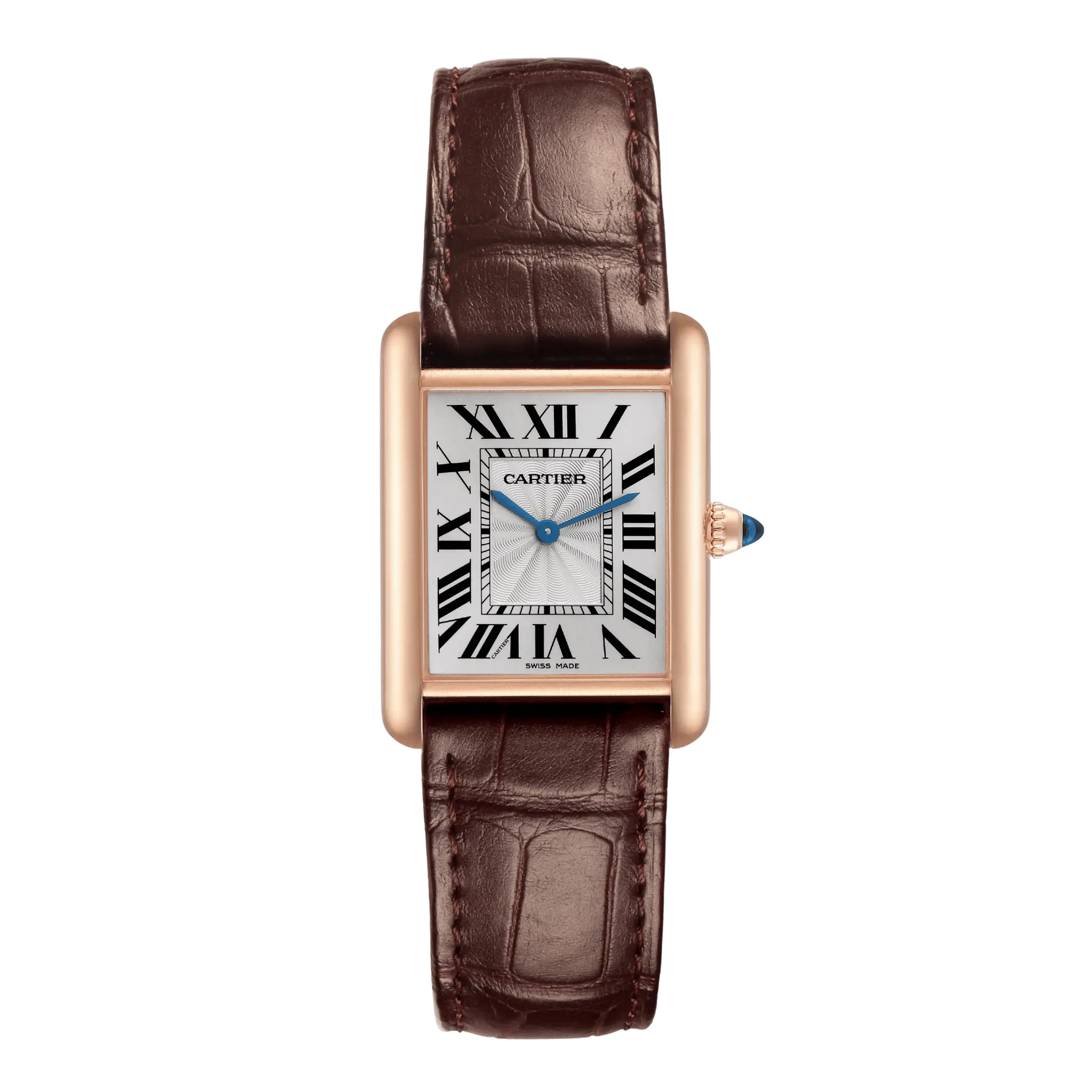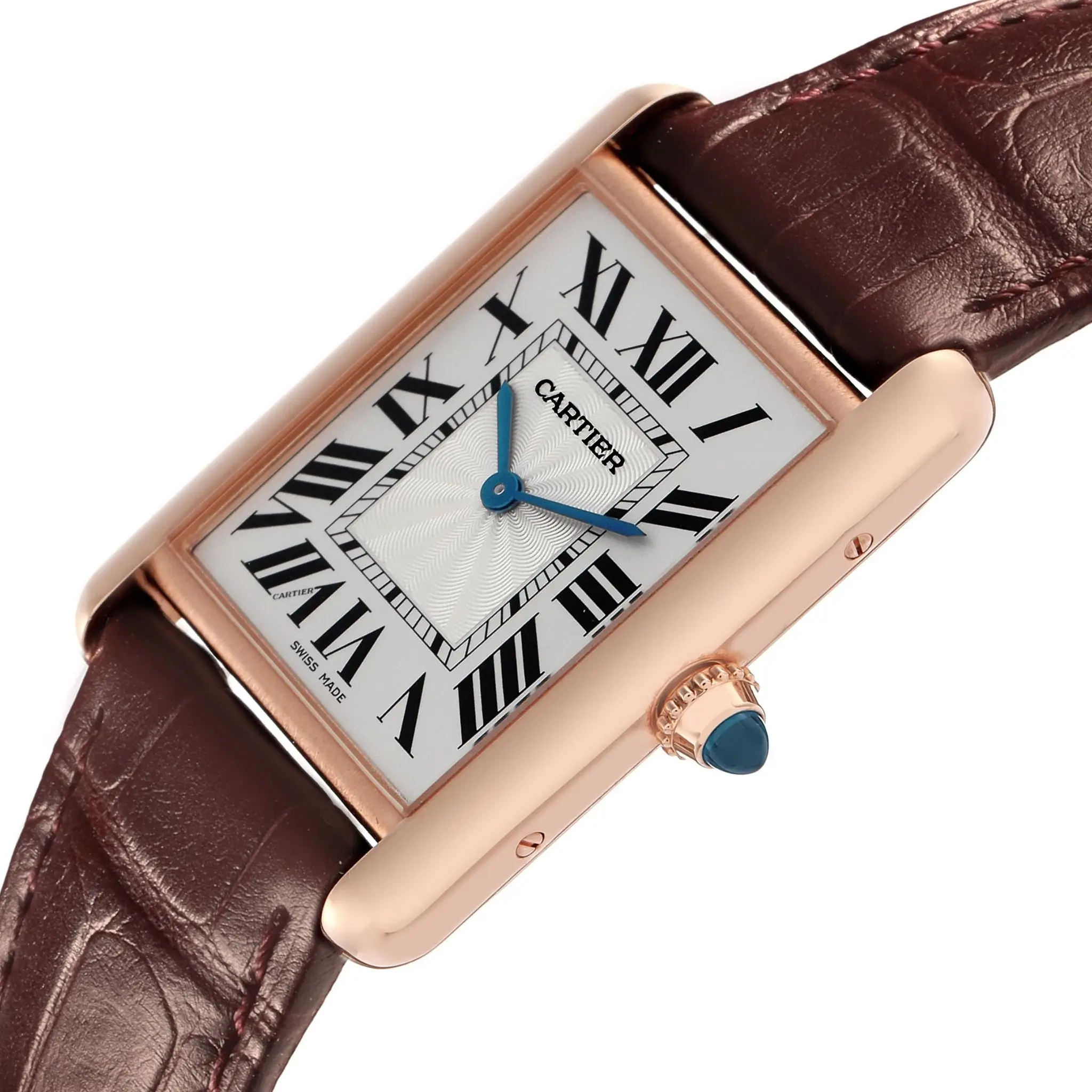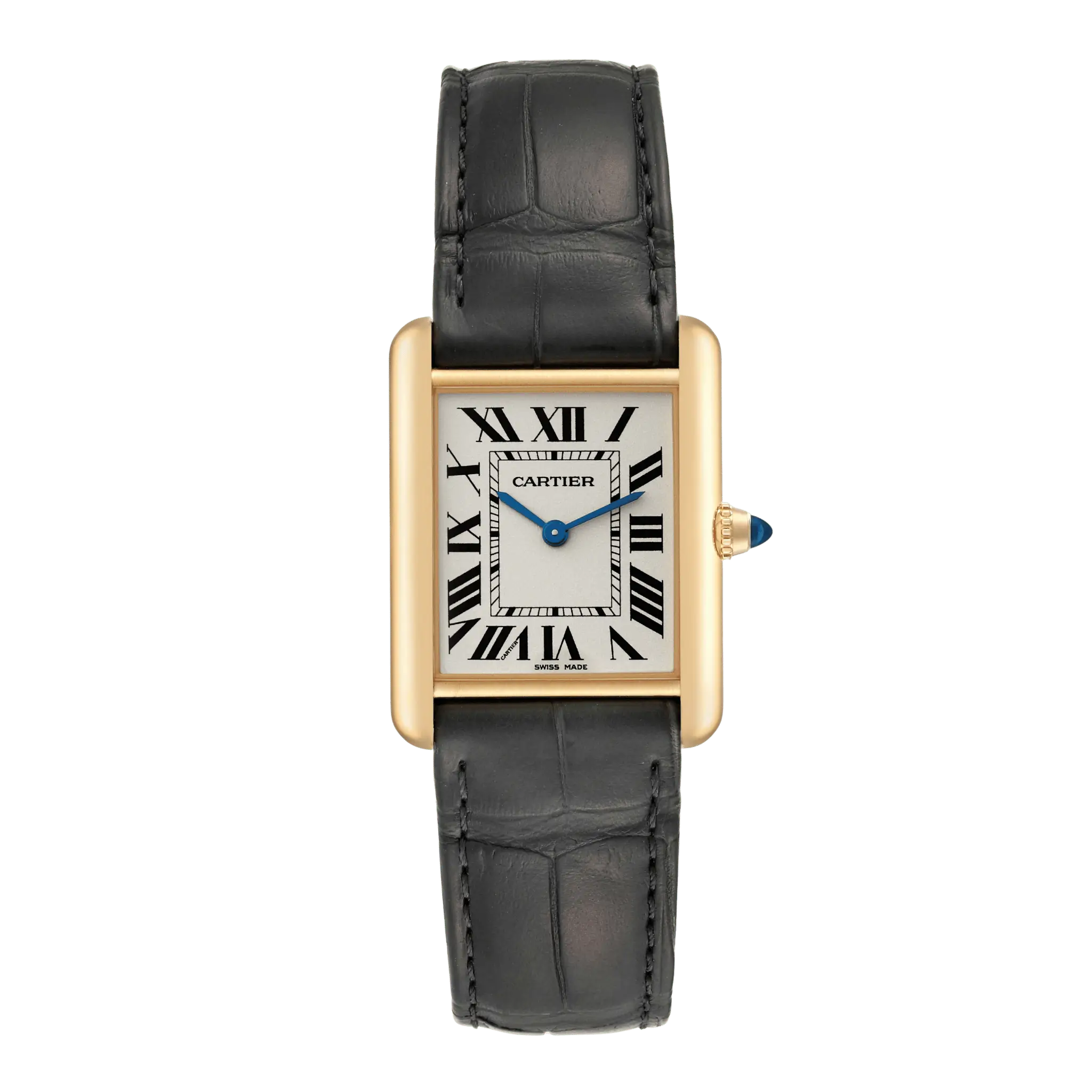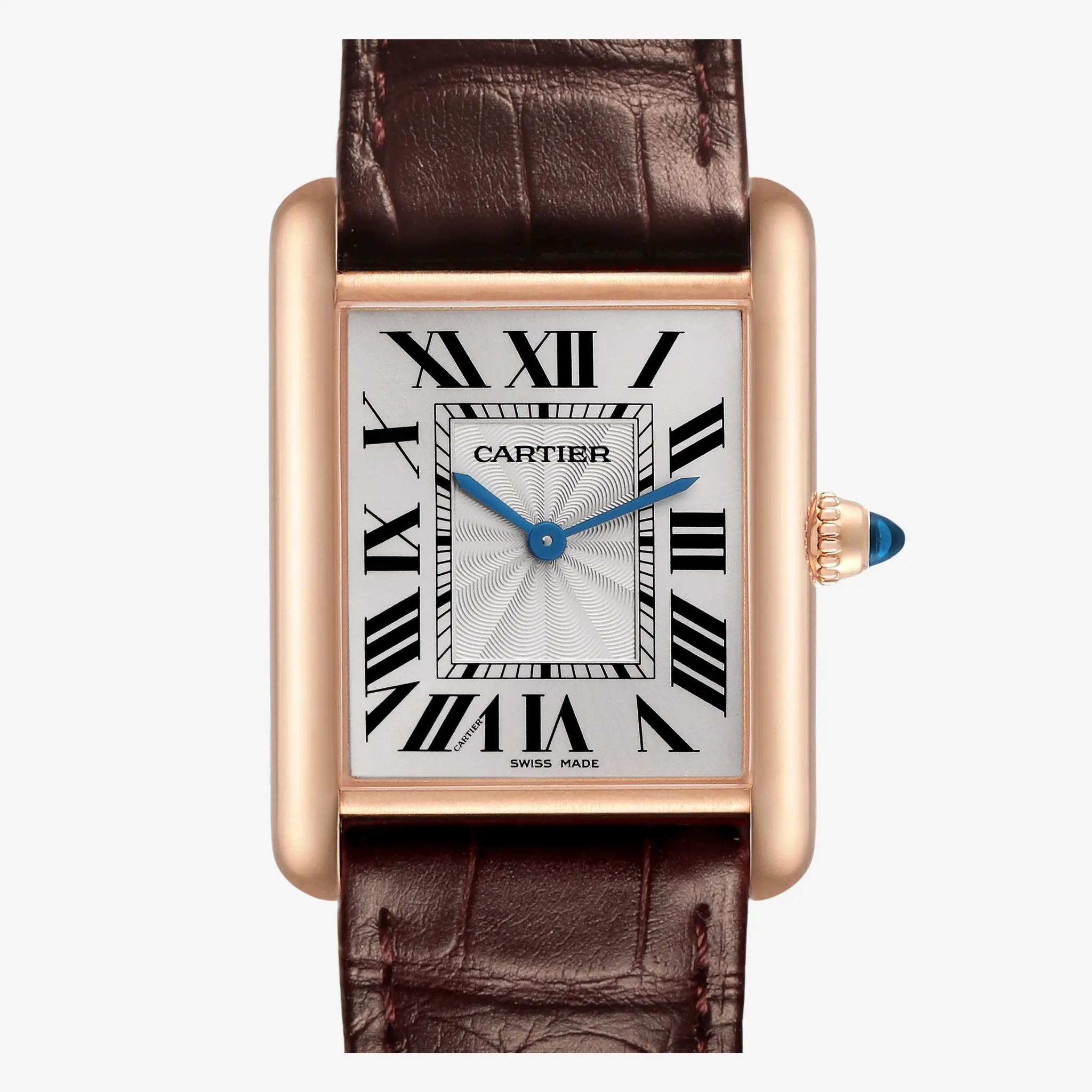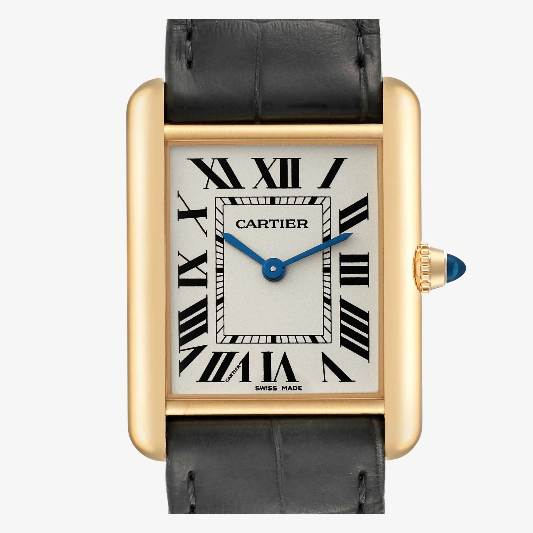 | Dial | Silvered beaded dial with black Roman numeral hour markers and an inner minute track. Sword-shaped blued-steel hands. Secret Cartier signature at VII. |