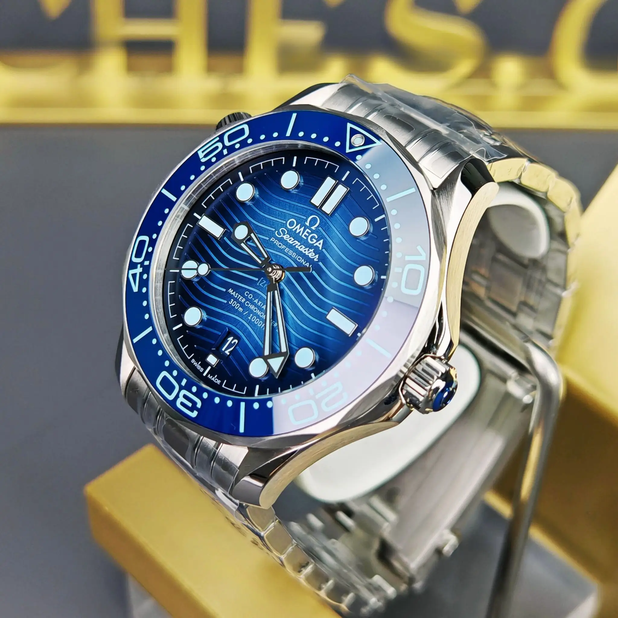 • 42mm Stainless Steel Case: Iconic Seamaster Diver 300M design, paired with a unidirectional rotating bezel featuring a green ceramic ring.