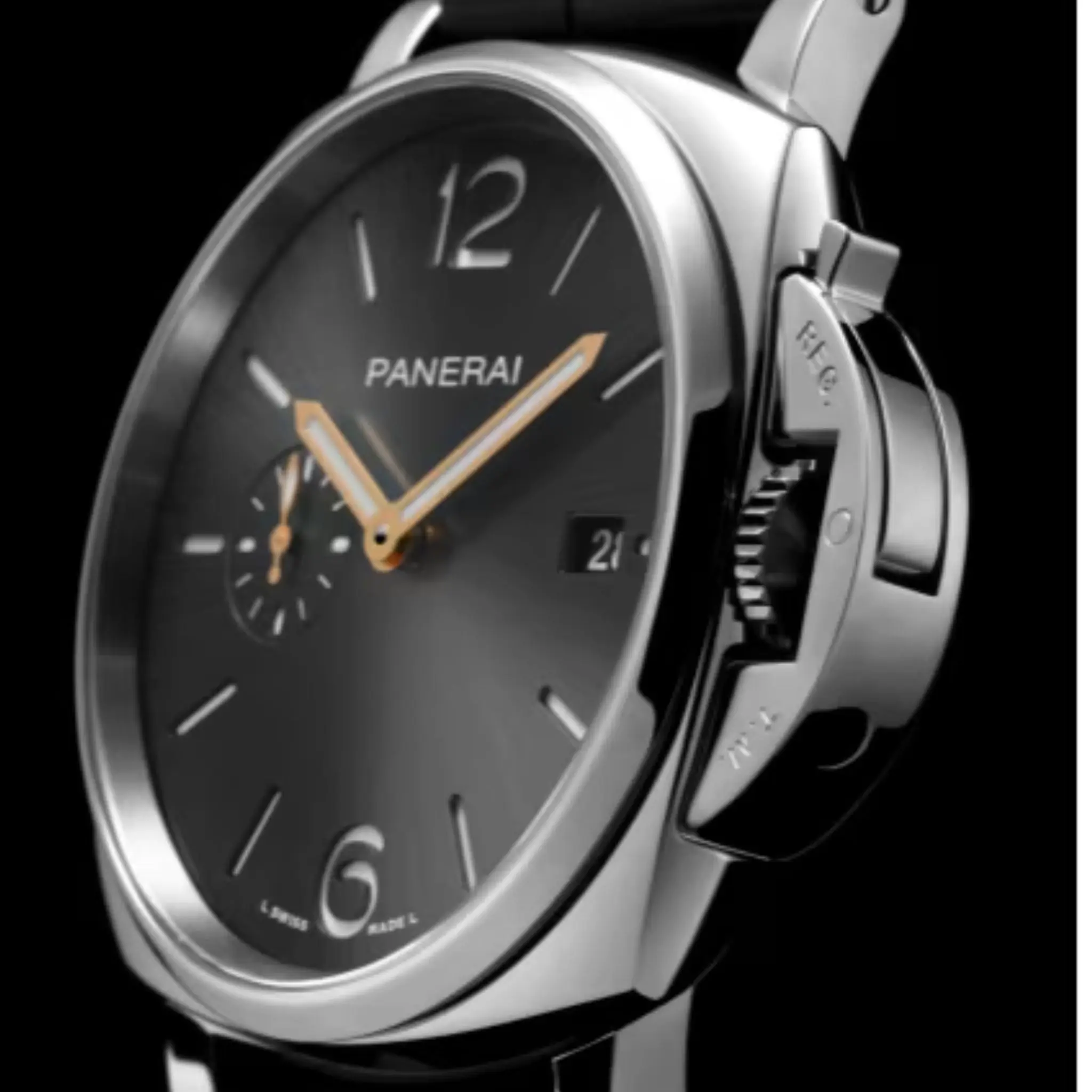 | Dial | Features a Black dial with large, luminescent hour markers and numerals (12, 6). The date window at the 3 o’clock position adds practical functionality, merging simplicity with legibility. The dial design maintains the iconic Luminor aesthetic, presenting a sleek and refined look. |