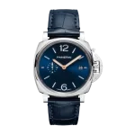 Dial Features a Black/Blue/White dial with large, luminescent hour markers and numerals (12, 6). The date window at the 3 o’clock position adds practical functionality, merging simplicity with legibility. The dial design maintains the iconic Luminor aesthetic, presenting a sleek and refined look.