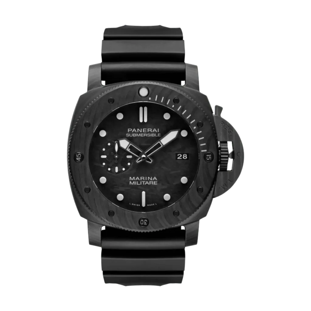 | Case | Carbotech forged carbon case, 42.0 mm in diameter. Titanium case back. Panerai patented crown protector. |