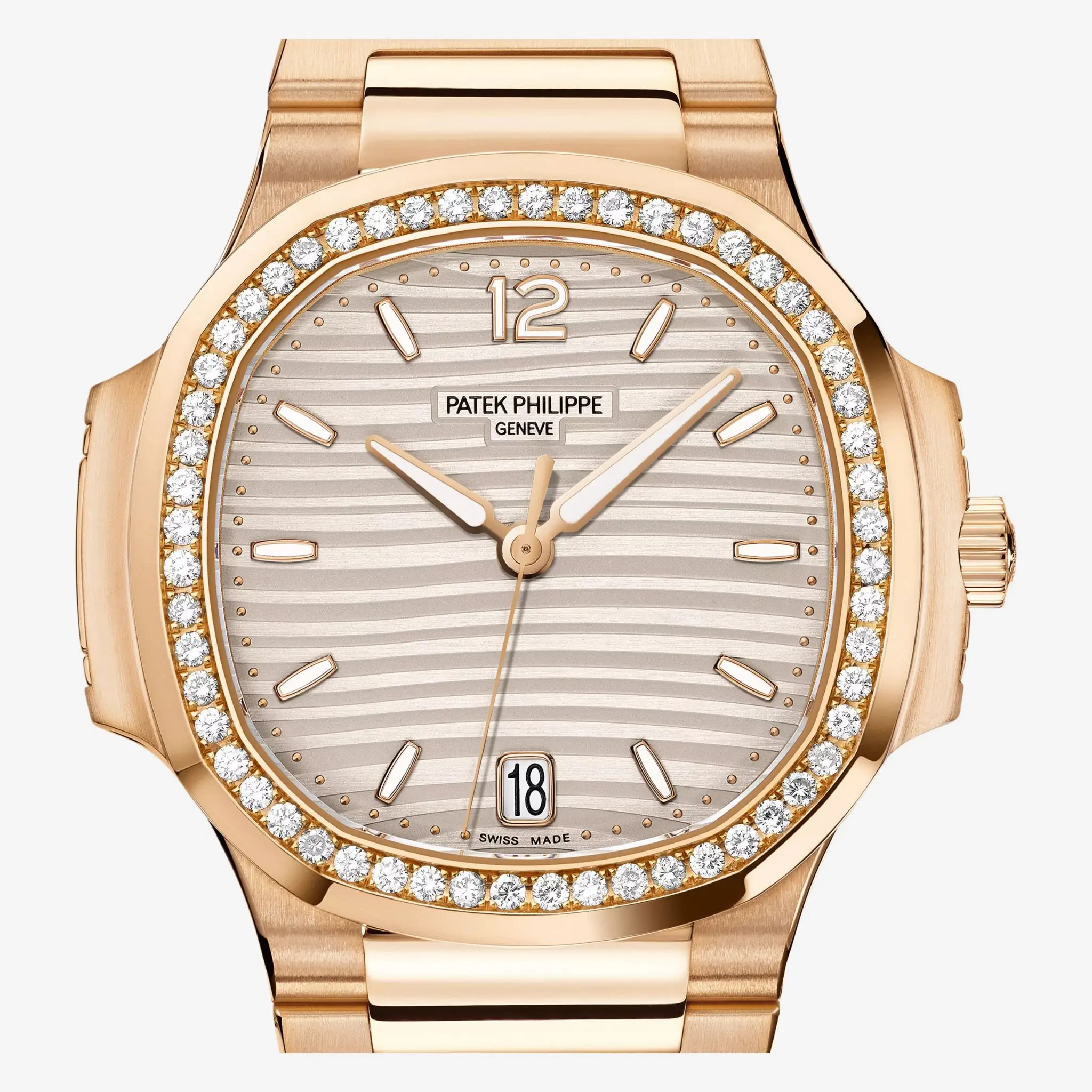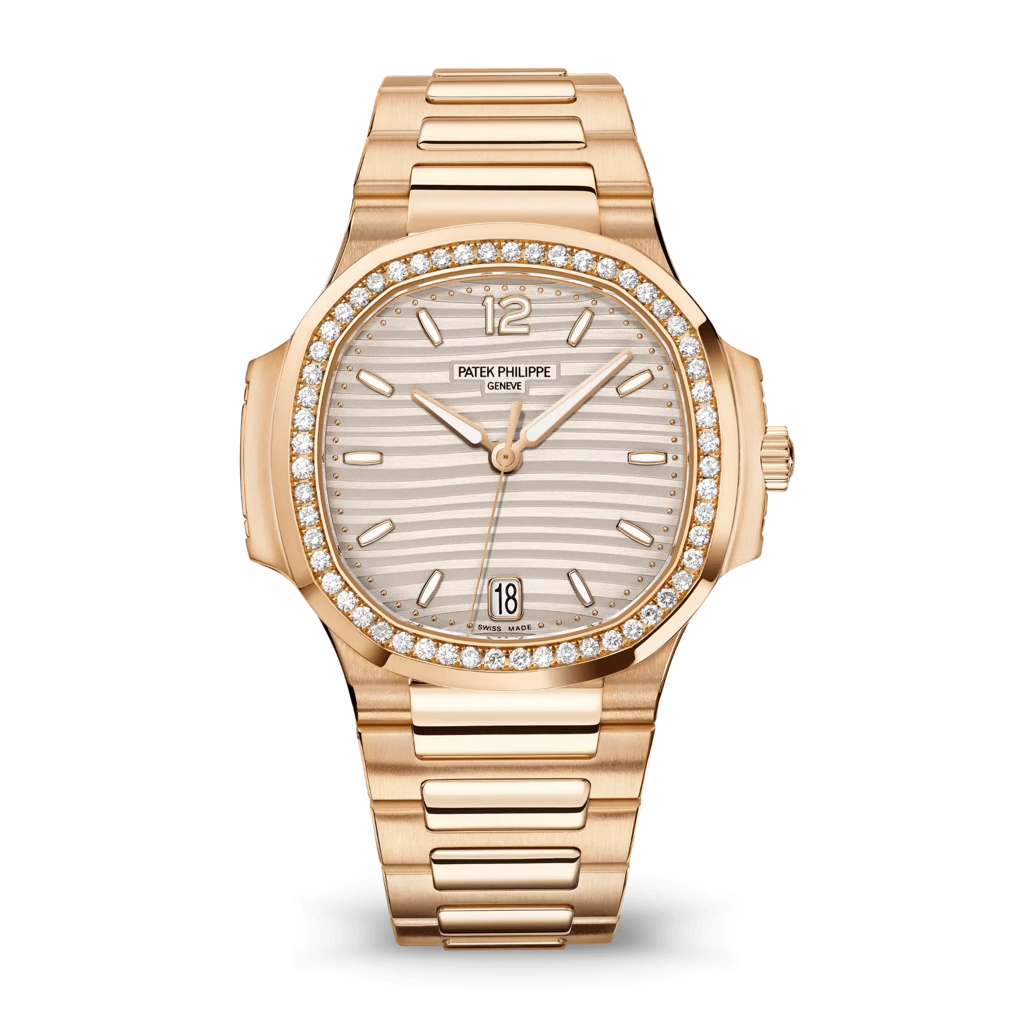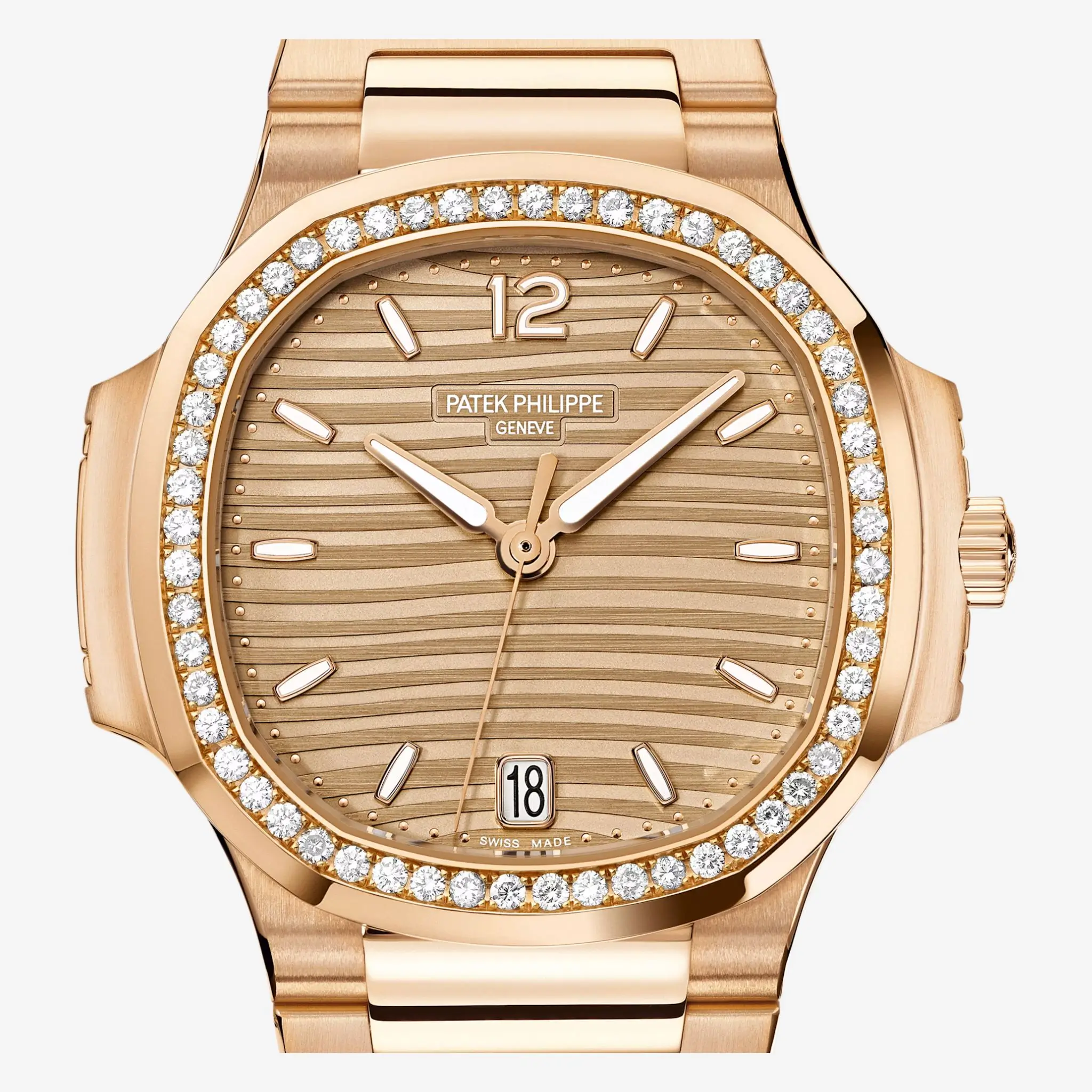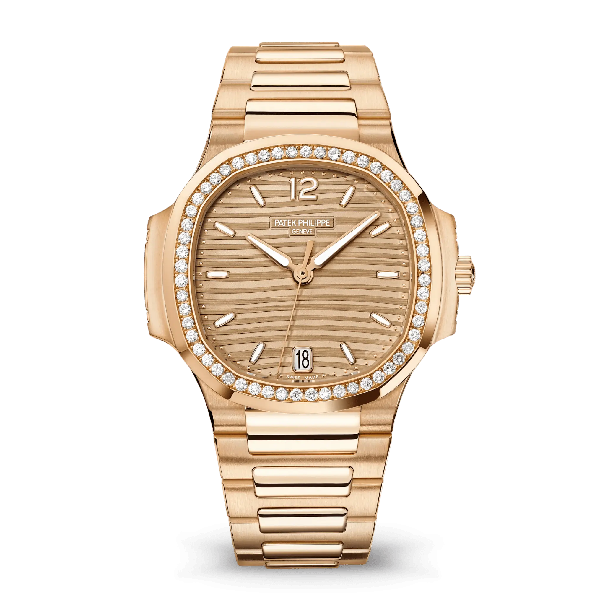Its beautifully detailed dial showcases the iconic Nautilus wave pattern, complemented by polished hour markers, luminous accents, and refined hands for balanced legibility and elegance. The harmonious blend of rose-gold tones and diamond brilliance creates a graceful yet striking wrist presence.