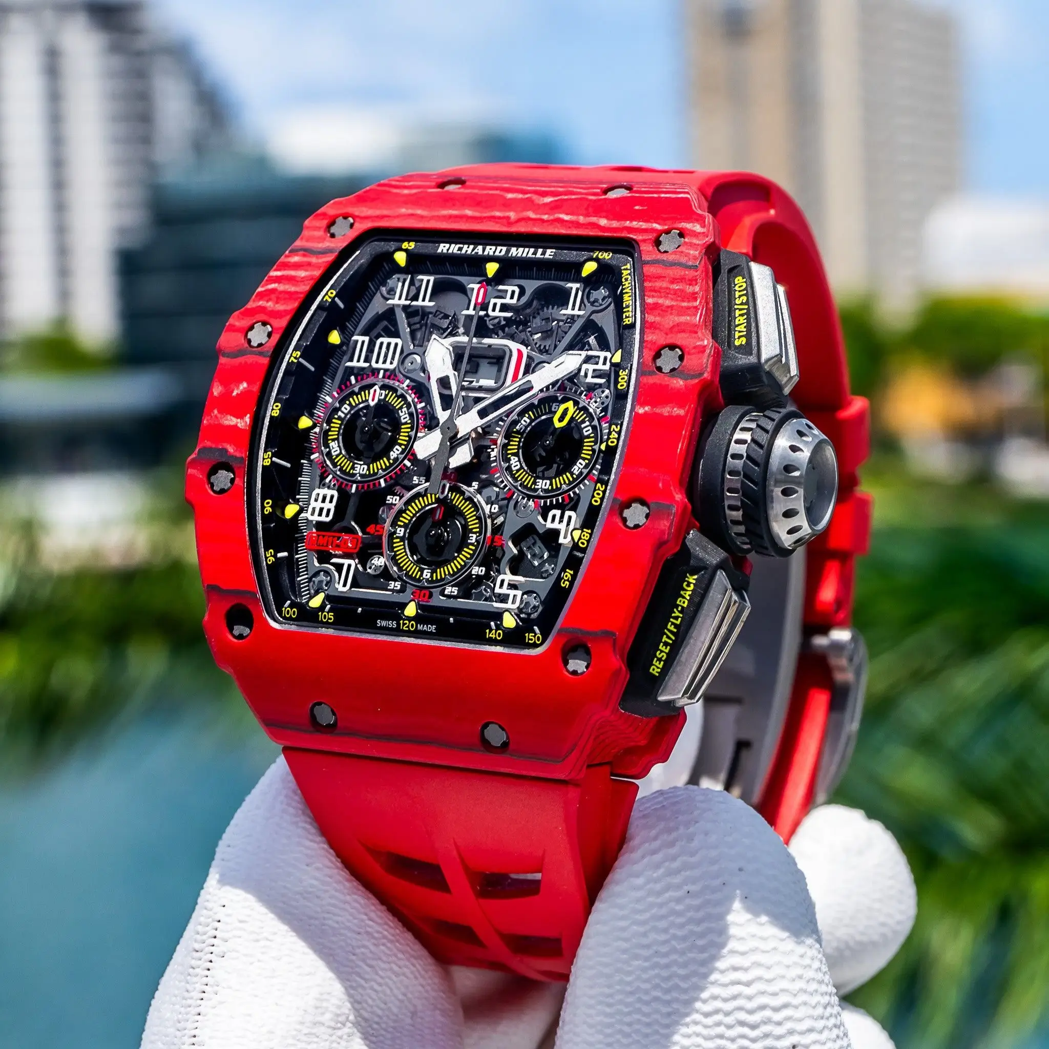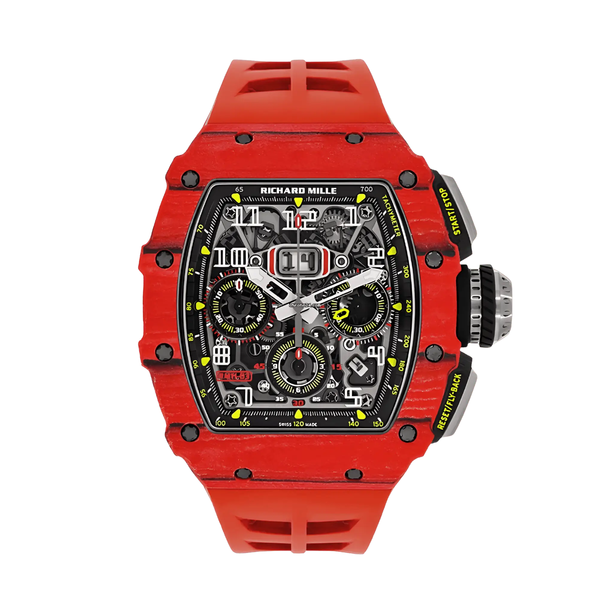 This Richard Mille RM1103 Red Replica features a striking red – colored 904L stainless steel case and scratch – resistant sapphire crystal. Its black rubber strap, skeleton dial, and chronograph function combine style and practicality for watch enthusiasts.