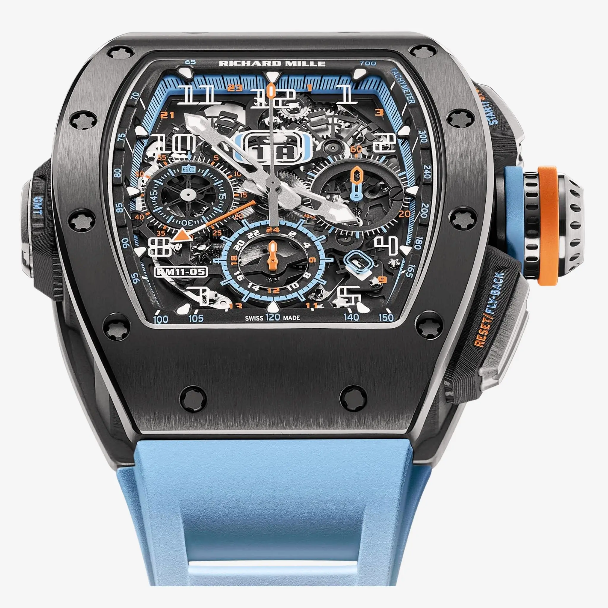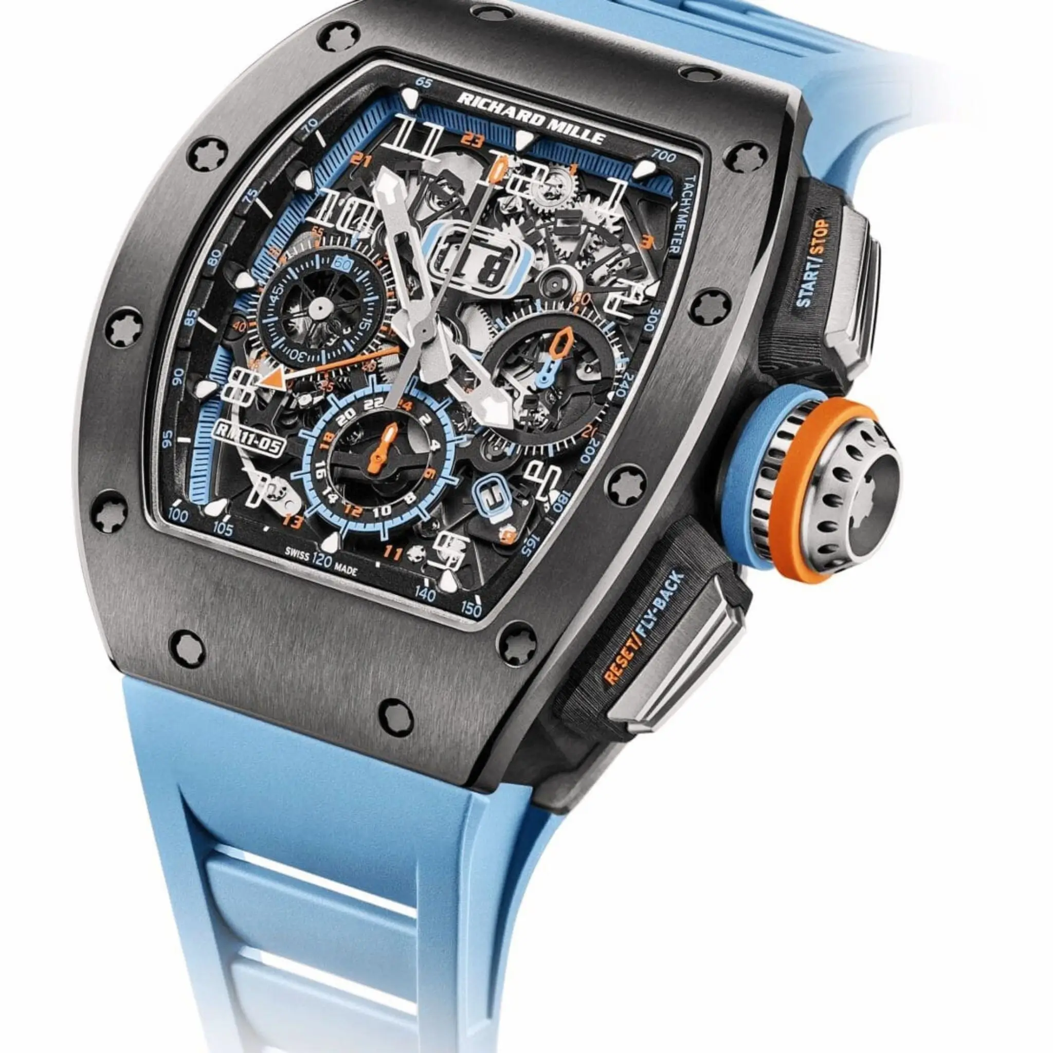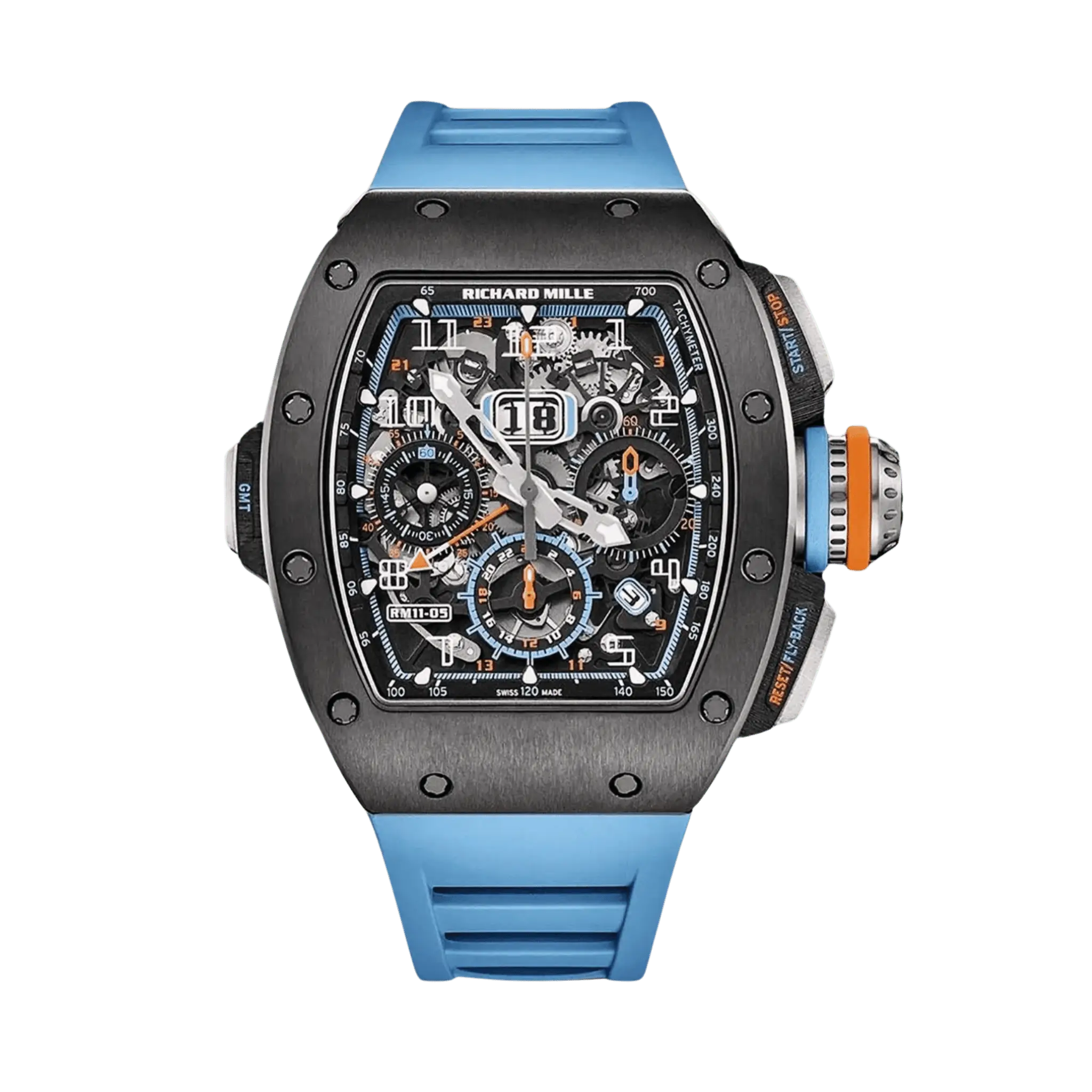 This Richard Mille Flyback Chronograph RM011 – 05 Replica features a black PVD – plated stainless steel case and scratch – proof sapphire crystal. Its skeleton dial, blue rubber strap, and chronograph function combine style and practicality for watch enthusiasts.
