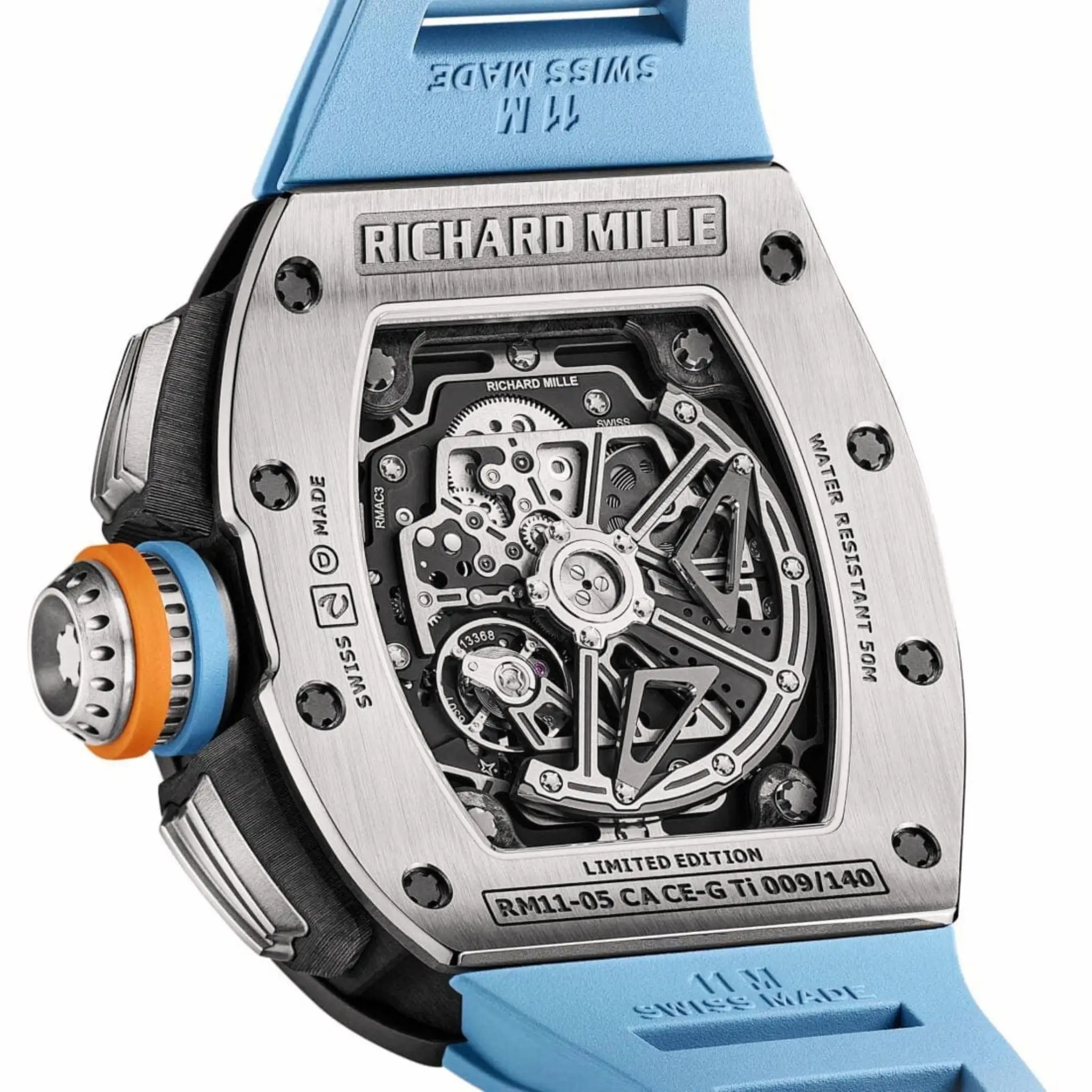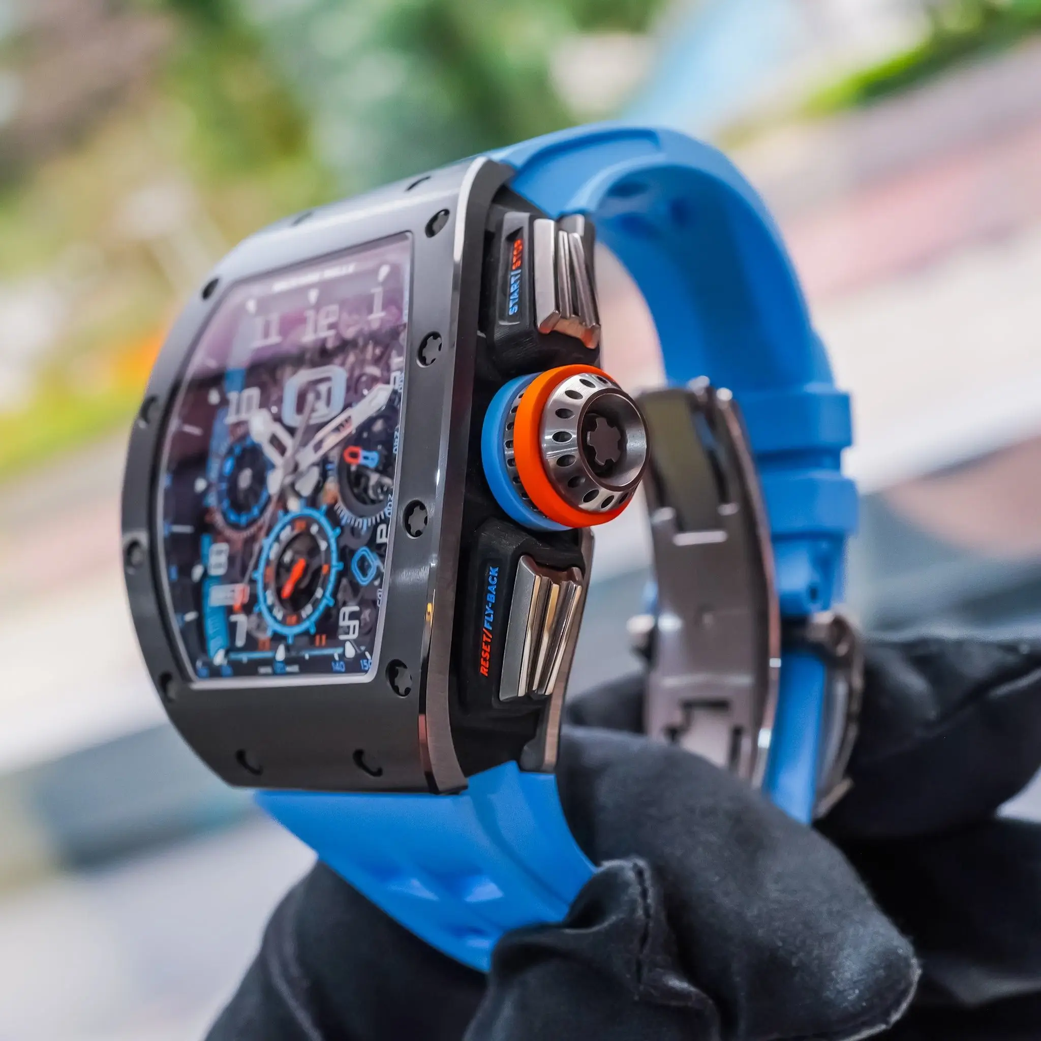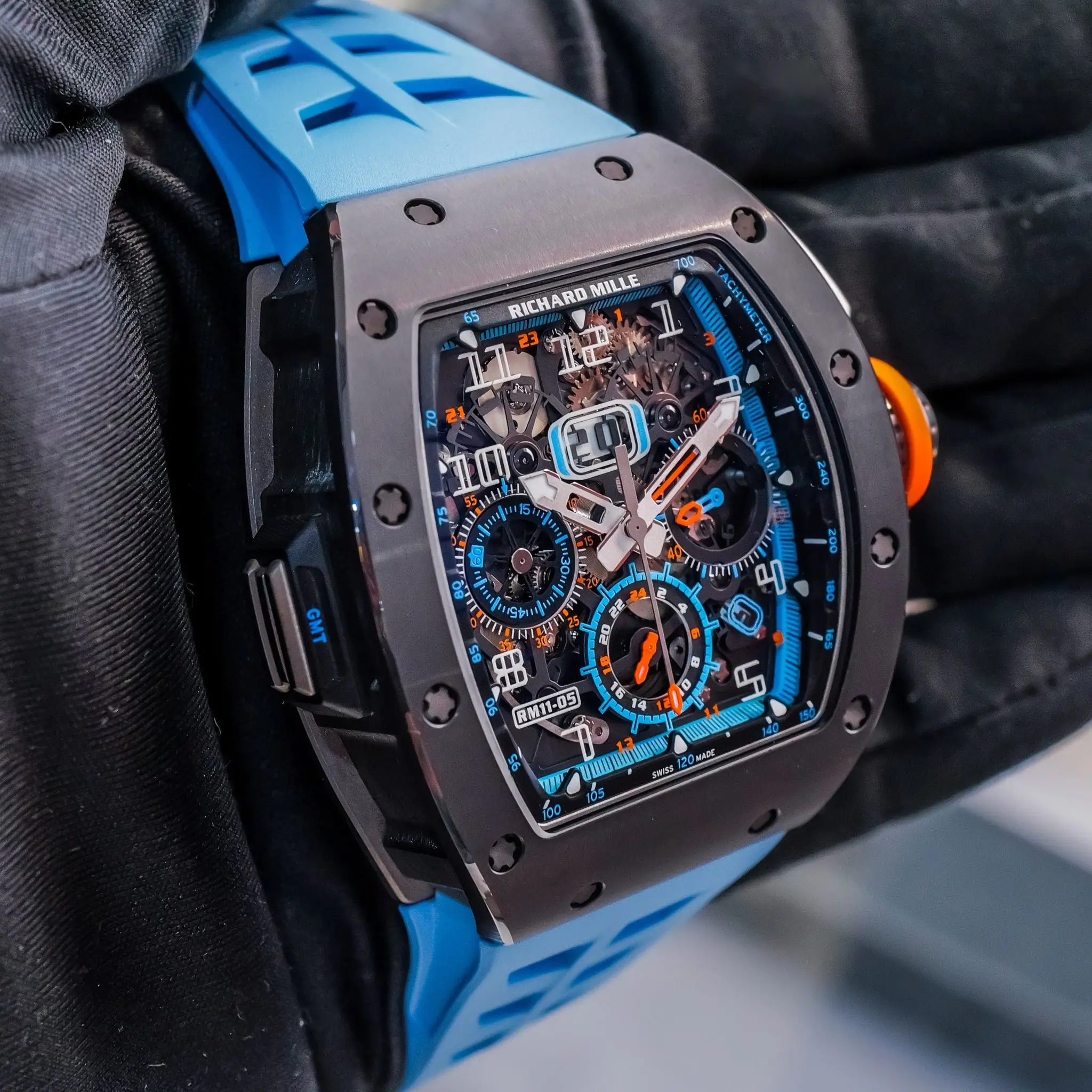 This Richard Mille Flyback Chronograph RM011 – 05 Replica features a black PVD – plated stainless steel case and scratch – proof sapphire crystal. Its skeleton dial, blue rubber strap, and chronograph function combine style and practicality for watch enthusiasts.